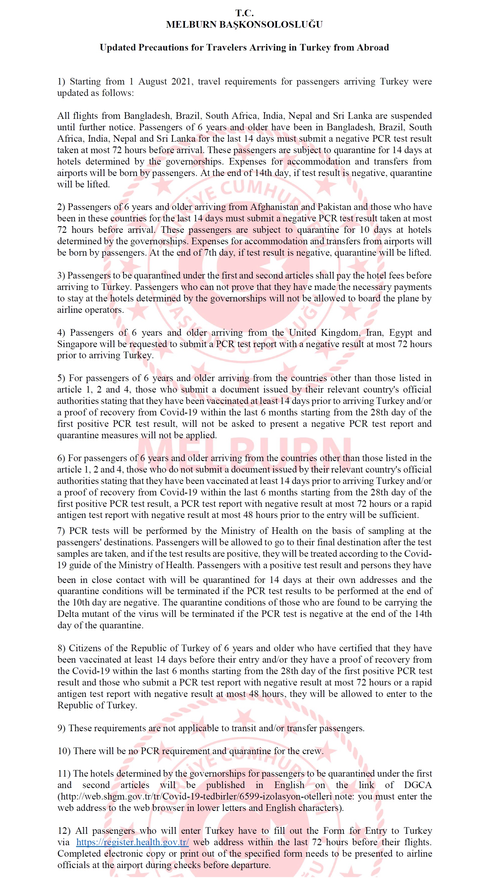 12) All passengers who will enter Turkey have to fill out the Form for Entry to Turkey via https://register.health.gov.tr/web address within the last 72 hours before their flights. Completed electronic copy or print out of the specified form needs to be presented to airline officials at the airport during checks before departure.