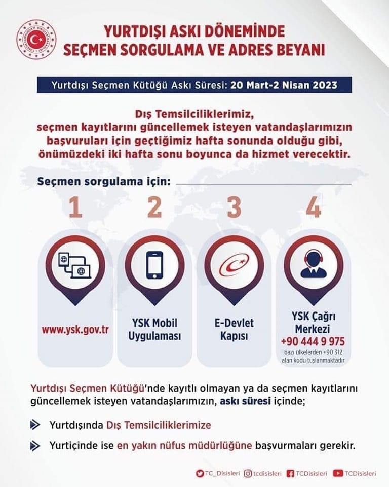 Başkonsolosluğumuz ve tüm dış temsilciliklerimiz, 20 Mart-2 Nisan tarihlerinde (2 Nisan saat 10:00 am Eastern Time'a kadar) askıda kalacak olan seçmen kayıtlarını güncellemek isteyen vatandaşlarımızın başvuruları için, bu hafta sonunda olduğu gibi, önümüzdeki hafta sonu boyunca da hizmet verecektir.