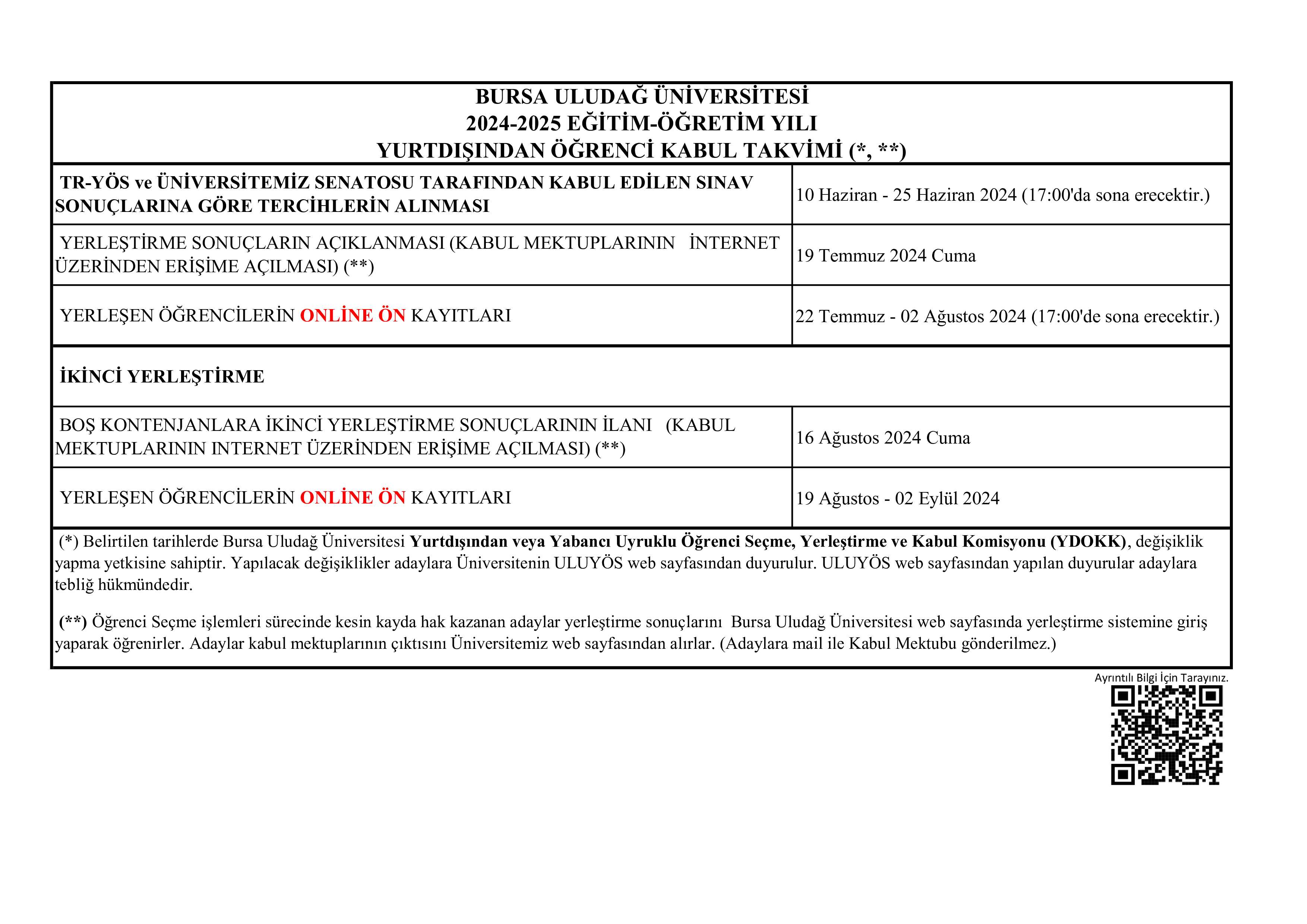 Bursa Uludağ Üniversitesi’nin 2024-2025 dönemi için yurtdışından öğrenci kabul kontenjanlarına tercih başvuruları 10 Haziran-25 Haziran 2024 tarihlerinde yapılacaktır.