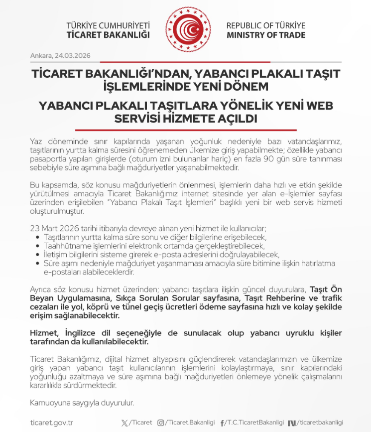Vatandaşlarımızın ve ülkemize giriş yapan taşıt kullanıcılarının işlemlerini kolaylaştırmak ve sınır kapılarındaki yoğunluğu azaltmak amacıyla Ticaret Bakanlığı tarafından hizmete alınan ''Yabancı Plakalı Taşıt İşlemleri'' başlıklı yeni web servis hizmetine aşağıdaki bağlantıdan ulaşılması mümkündür.